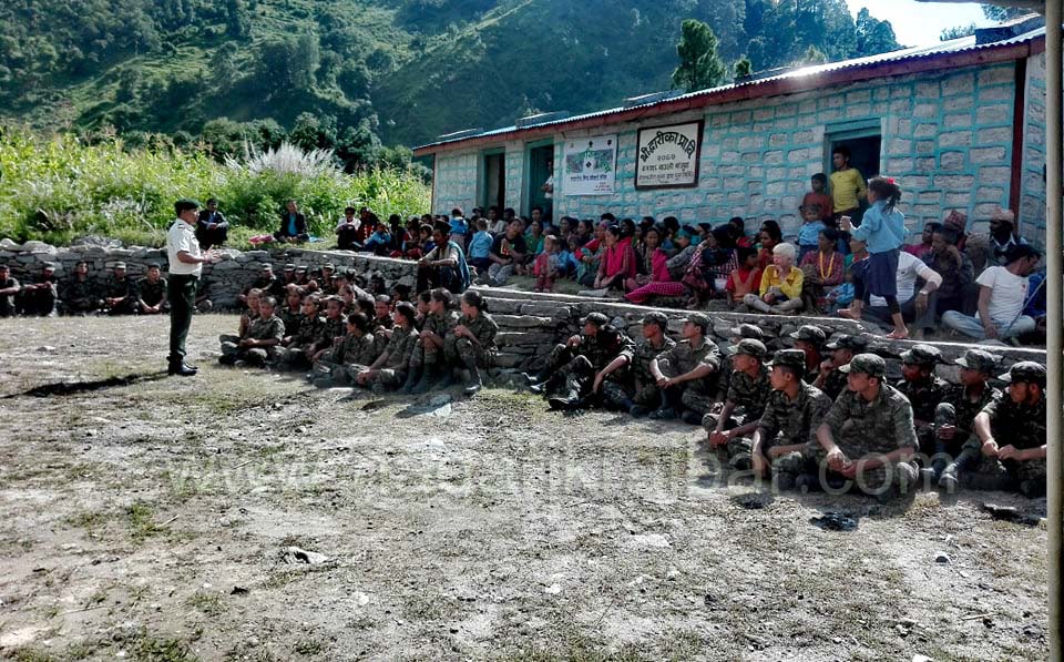 नागरिक रैबार/बाजुरा २४ भदौ । नेपाली सेनाले विपद्बाट जोगिनका लागि पुर्व अभ्यास गराएर सचेतना फैलाएको छ । मंगलबार समरजित गुल्मले विपद्बाट कसरी जोगिने ? विपद्मा परिहालेमा कसरी उद्धार गर्ने विपद् व्यवस्थापन कसरी गर्ने ? भन्ने बिषयमा द्धावारिका प्राविका शिक्षक, विद्यार्थी र अभिभावकहरुलाई विपद् बाट जोगिन पुर्व अभ्यास गराएको हो ।