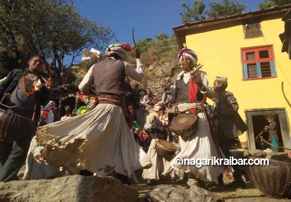स्वामिकार्तिक गाउँपालिका १ साप्पाटाको बाहुनीगाउँमा मेलामा दमाह बाजा बजाउँदै स्थानीयहरु । तस्वीर प्रमित विक