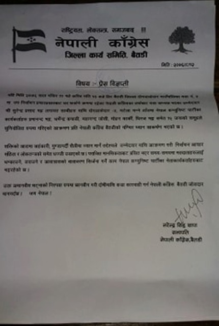 शक्तिको आडमा कांग्रेसका उम्मेद्वारमाथि आक्रमण गरी उल्टै सामाजिक सञ्जाल मार्फत तरुण दलका अध्यक्ष घनश्याम भट्टको चरित्र हत्या गर्ने काम भएको भन्दै खेद प्रकट गरेको छ। तरुण दलका जिल्ला उपाध्यक्ष महेश भट्टद्वारा हस्ताक्षरित विज्ञप्तीमा घटनाका दोषीलाई कारवाही गर्न समेत माग गरेको छ।