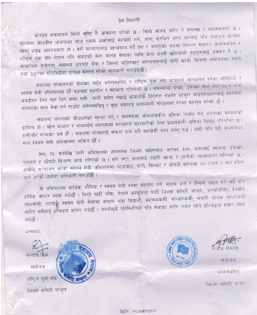 जेठ महिनाको अन्तिम साताबाट नेकपा निकट युवा र विद्यार्थीहरले सूर गरेको महामारिका बेला जनतालाई राहत वितरण गरेका छन् । जिल्ला बाहिबाट पाँच हजार बढीको संख्यामा सर्वसाधारणहरु जिल्ला भित्रिएका छन् । जिल्ला बाहिरबाट बाजुरा भित्रिएकाहरुले यात्राको क्रममा भोगेको समस्यालाई मध्येनजर गरेर जेठ २५ गतेबाट अनेरास्ववीयु र राष्ट्रिय युवा संघ नेपालले कोरोना भाईरस कोभिड-१९ को महामारीमा जनताको सेवामा स्वंमसेवक परिचालन अभियान चलाएका थिए ।