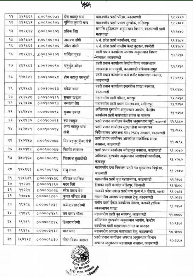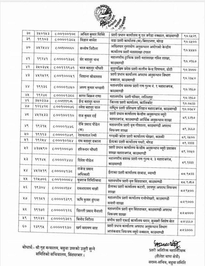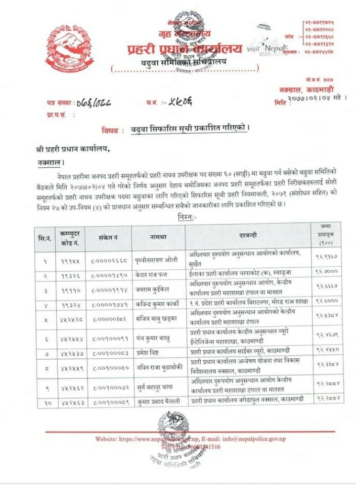 नेपाल प्रहरीले ६० जना इन्स्पेक्टरलाई डिएसपीमा बढुवाको लागी सिफारिस गरेको छ। प्रहरी मुख्यालय नक्सालमा बसेको बढुवा समितिको बैठकले ६० जना इन्स्पेक्टरको नाम डिएसपी बढुवाका लागी सिफारिस गरेको हो।