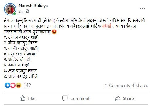 मंगलबार बालुवाटारमा केपि शर्मा ओली नेतृत्वको नेकपाको केन्द्रिय कमिटीको बैठकबाट बाजुराका ८ जनाले केन्द्रिय सदस्यको जिम्मेवारी प्राप्त गरेको अनेरास्ववीयुका नरेश रोकाया सामाजि संजाल मार्फत जानकारी गराएका छन् ।