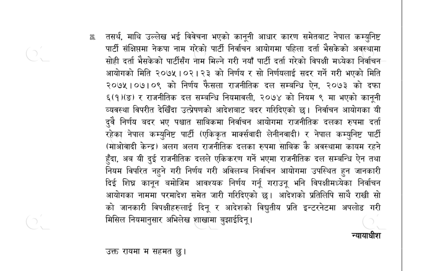 सर्वोच्चका न्यायाधीश बमकुमार श्रेष्ठ र कुमार श्रेष्ठको इजलासले निर्वाचन आयोगको उक्त निर्णय खारेज गरी तत्कालिन नेकपा एमाले र माओवादी केन्द्र अलग अलग राजनीतिक दलको रुपमा साविकको अवस्थामा कायम रहने फैसला गरेको हो । सर्वोच्चले अब यी राजनीतिक दलले एकता गर्ने भए राजनीतिक दलसम्बन्धी ऐन र नियम विपरीत नहुने गरी दर्ता गर्न निर्वाचन आयोगको नाममा परमादेश जारी गरेको छ ।