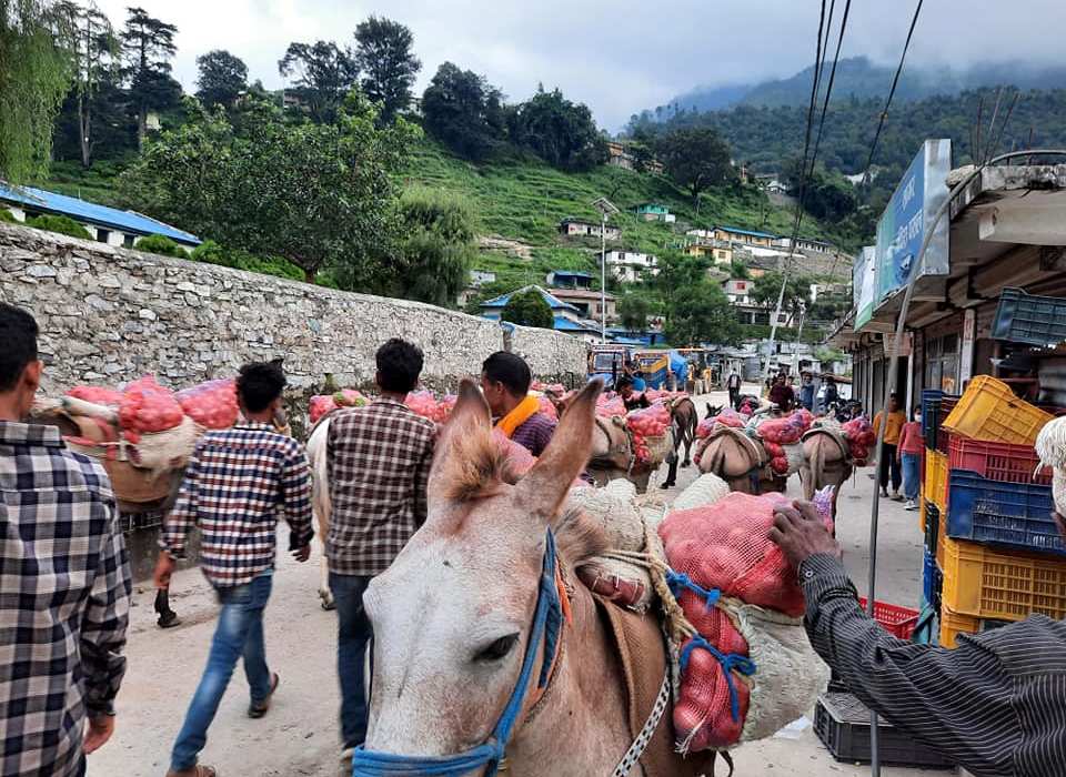 बाढी पहिरोका कारण सडक अबरुद्ध भएपछि खच्चडबाट ढुवानी गर्नु परेको कार्यालय प्रमुख गोविन्द सिजापतिले जानकारी दिनुभयो । खच्चडमार्फत आजै ढुवानी भएको १४ क्वइन्टल प्याज सदरमुकाम मार्तडी आईपुगेको उहाँले बताउनुभएको छ ।
