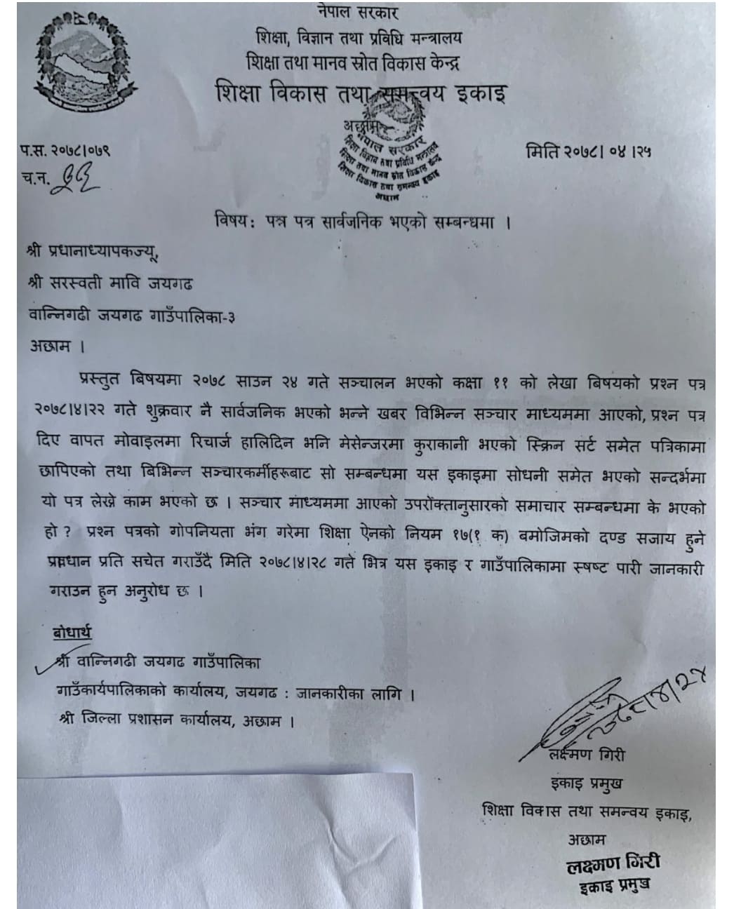 अछामः अछाममा कक्षा ११ को प्रश्नपत्र बाहिरीएको विषयमा शिक्षा विकास तथा समन्वय इकाईले विद्यालयलाई स्पष्टीकरण साेधेको छ।कक्षा ११ को लेखा विधिका सिद्धान्तको प्रश्नपत्र बाहिरीएको खबर प्रमाणसहित विभिन्न सञ्चार माध्यममा आएको भन्दै सरस्वती माध्यमिक विद्यालय जयगढलाई उक्त विषयमा स्पष्ट पार्न इकाईले पत्र पठाएको हो।