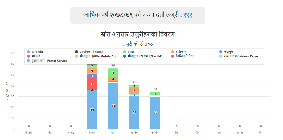 सुशासन र सदाचार प्रवद्र्धन, राजस्व चुहावट नियन्त्रणलगायत सार्वजनिक वित्त, सार्वजनिक सेवा प्रवाह र सेवाग्राहीको सरोकार, सार्वजनिक खरिद तथा आयोजना र कार्यक्रम व्यवस्थापन, कृषि, भूमि, वन तथा वातावरण, शिक्षा, स्वास्थ्य, सामाजिक सुरक्षा लगायत विषयमा बर्सेनि उजुरी पर्ने गरेको छ।