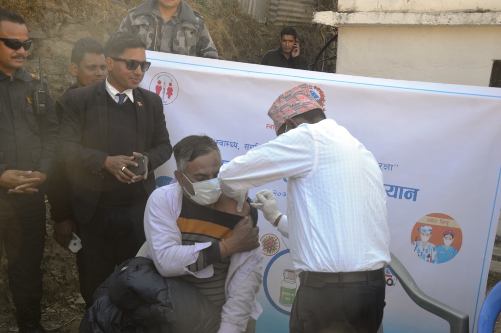 नागरिक रैबार/बाजुरा १५ माघ। बाजुरामा पनि आजबाट कोरोना विरुद्धको खोप लगाउन शुरु गरिएको छ ।बाजुरामा आज कोराना विरुद्धको पहिलो खोप जिल्ला अस्पताल बाजुराका कार्यालय प्रमुख डाक्टर रुपचन्द्र विश्वकर्माले स्वास्थ्य कार्यालय बाजुराका जनस्वास्थ्य अधिकृत दयाकृष्ण पन्तलाई खोप लगाएर अभियानको सुरुवात गरेका हुन ।