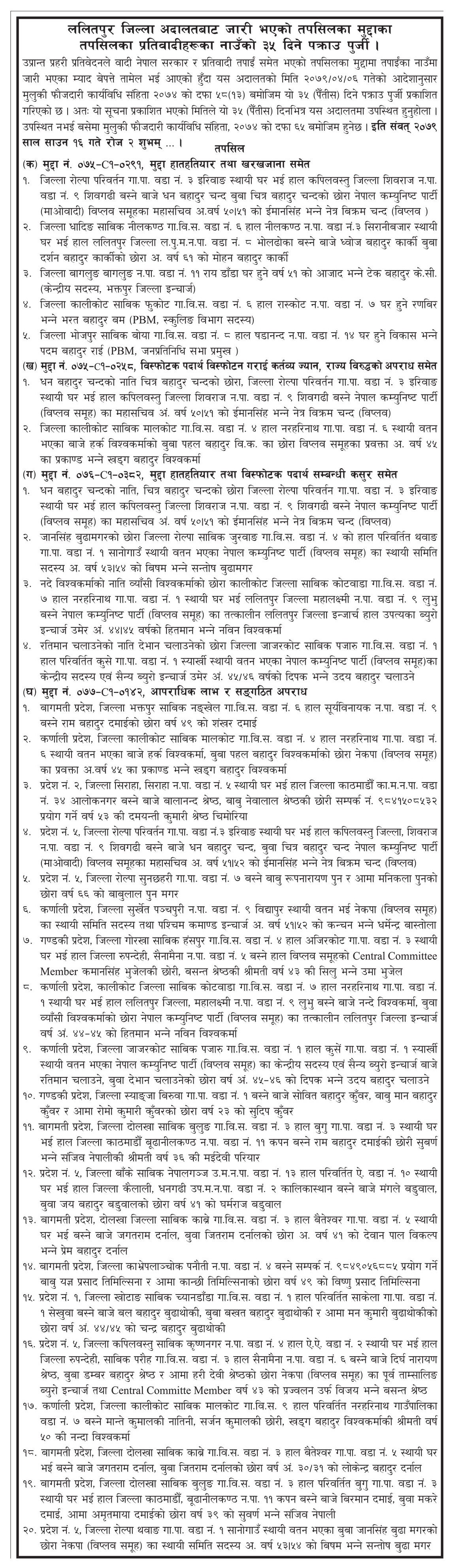 उनीहरूविरूद्ध हातहतियार तथा खरखजाना मुद्दा, विस्फोटक पदार्थ विस्फोटन गराई कर्तव्य ज्यान, राज्य विरुद्धको अपराध समेतको मुद्दा, हातहतियार तथा विस्फोटक पदार्थ सम्बन्धी कसुरको मुद्दा लागेको भन्दै पक्राउ पुर्जी जारी भएकाे हो।