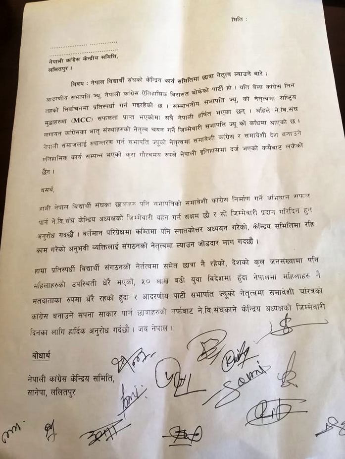 ‘नेविसंघका छात्राहरू समावेशी कांग्रेस निर्माण गर्ने अभियान सफल पार्न नेविसंघ केन्द्रीय अध्यक्षको जिम्मेवारी बहन गर्न सक्षम छौं,’ नेताहरूलाई बुझाइएको ज्ञापन पत्रमा उल्लेख छ।