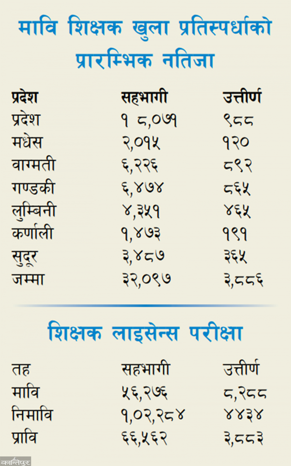 शिक्षक सेवा आयोगले गत वर्ष प्रकाशन गरेको शिक्षक लाइसेन्स परीक्षामा २ लाख २५ हजार १ सय २२ जना सामेल भएकामा १६ हजार ९ सय ५ जना मात्रै सफल भएका थिए । सय पूर्णाङ्कको लाइसेन्स परीक्षामा १० अंकभन्दा कम ल्याउने परीक्षार्थीको संख्या उल्लेख्य रहेको आयोगका कर्मचारीहरूले बताएका छन् । आयोगका अनुसार मावि तहमा ५६ हजार २ सय ७६ जनाले लाइसेन्स परीक्षा दिँदा ८ हजार २ सय ८८ जना अर्थात् १४ दशमलव ७३ प्रतिशत मात्रै सफल बनेका हुन् । निमाविमा १ लाख २ हजार २ सय ८४ जना सहभागी भएकामा ४ हजार ४ सय ३४ जना अर्थात् ४ दशमलव ६३ प्रतिशत मात्रै लाइसेन्स पाउन योग्य ठहरिएका थिए । प्रावि तहमा ६६ हजार ५ सय ६२ परीक्षार्थीमध्ये ३ हजार ८ सय ८३ अर्थात् ५ दशमलव ५३ प्रतिशत मात्रै उत्तीर्ण भए ।