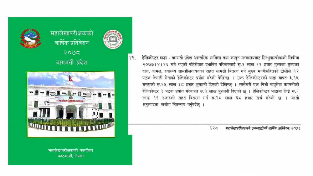 तत्कालीन मुख्यमन्त्री डोरमणि पौडेलसहित सिन्धुपाल्चोक पुगेको मन्त्रीहरूको टोलीले हेलिकोप्टर भाडाबापत ३ घण्टा १५ मिनेटको २५ लाख ६८ हजार रुपैयाँ भुक्तानी गरेको छ । एक निजी वायुसेवा कम्पनीको हेलिकोप्टर पनि तीन पटक प्रयोग भएको प्रतिवेदनमा उल्लेख छ । उक्त हेलिकोप्टर प्रयोगबापत ३ लाख रुपैयाँ भुक्तानी भएको छ । ‘१ लाख ११ हजारको राहत वितरण गर्न कुल २८ लाख ६८ हजार रुपैयाँ खर्च भएको छ । यस्तो अनुत्पादक खर्च रोक्नुपर्छ,’ महालेखाको प्रतिवेदनमा भनिएको छ ।