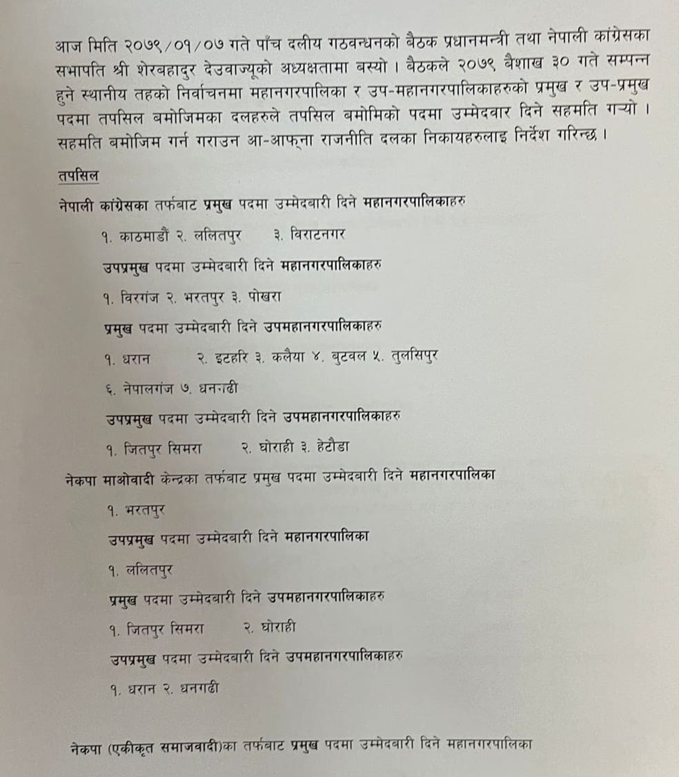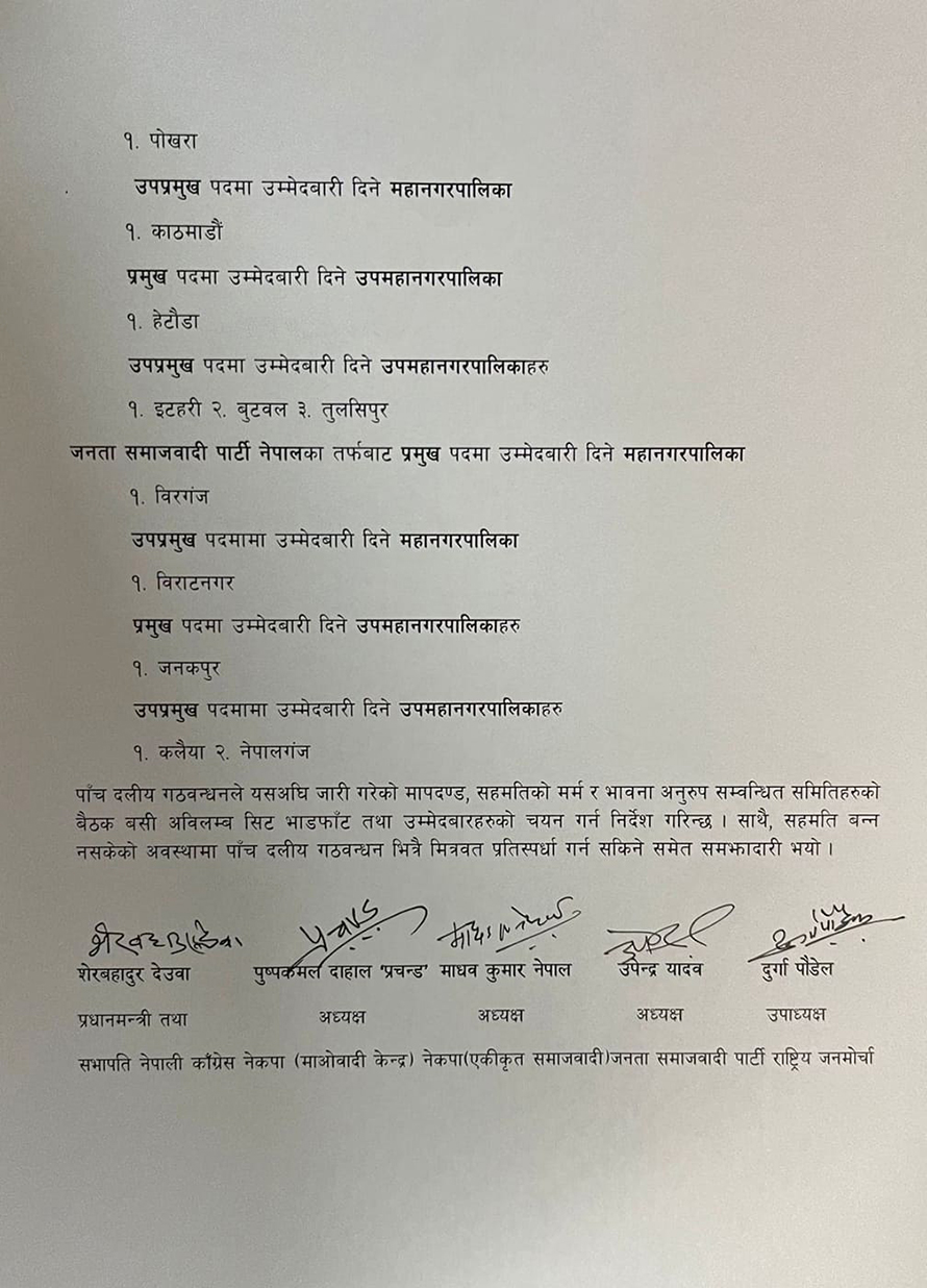 बुधबार प्रधानमन्त्रीको सरकारी निवास बालुवाटारमा बसेको नेपाली कांग्रेस, नेकपा माओवादी केन्द्र, नेकपा एकीकृत समाजवादी, जनता समाजवादी पार्टी र राष्ट्रिय जनमोर्चाबीच महानगर र उपमहानगरको मेयर र उपमेयरमा लिखित सहमति नै भएको हो ।