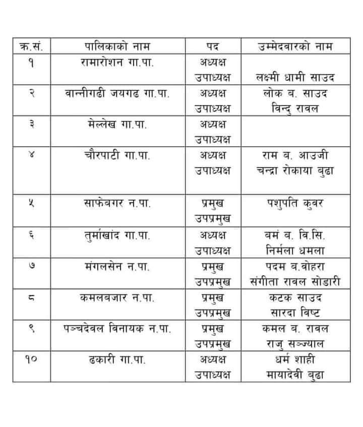 • अछामका १० पालिकामा यी हुन् एमालेका उम्मेदवार