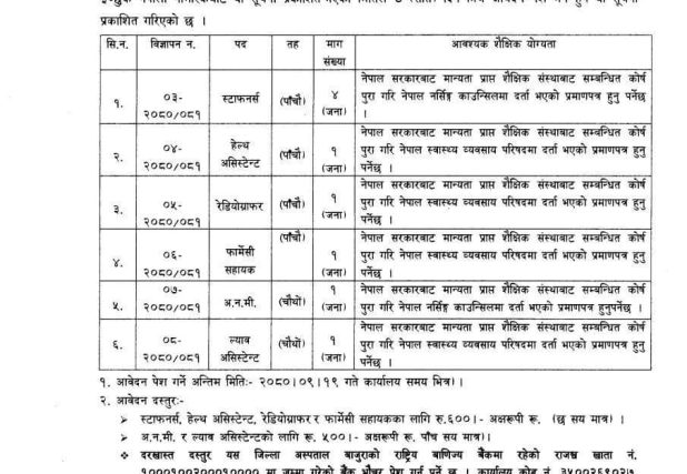 विभिन्न पदमा इच्छुक व्यक्तिलाई आवश्यक कागजात सहित सात दिन भित्र दरखास्त पेस गर्न आग्रह गरिएको छ ।