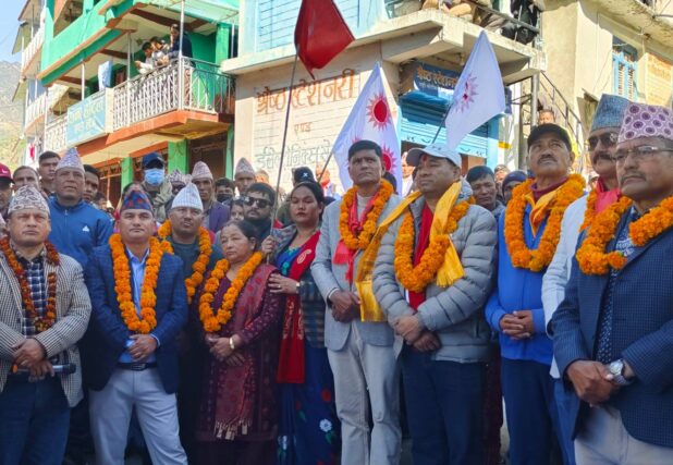 नेकपा एमाले बाजुराले सदरमुकाम मार्तडीमा र्यालीसहित बजार परिक्रमा गरेर लाेकतान्त्रिक चाेकमा जनसभाकाे आयाेजना गरेकाे हाे ।